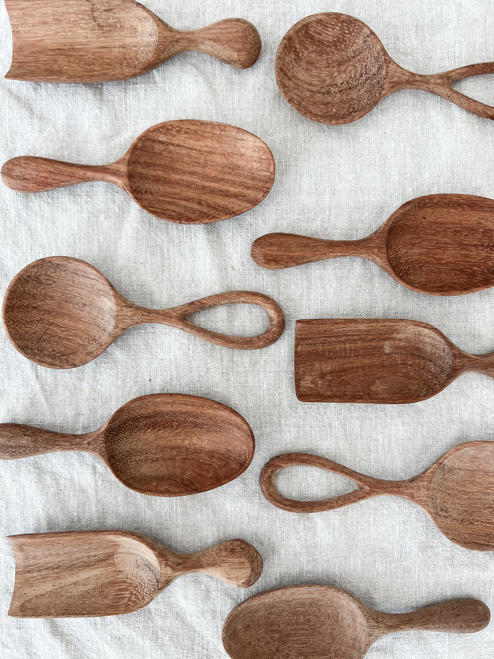 These hand-carved, wooden spoons/scoops are perfect as pantry scoops, tea scoops, to add to charcuterie boards, for nature play or simply for aesthetic styling props. Each one has been carved, sanded and polished by the hands of traditional artisans in a Vietnamese wood-carving village.